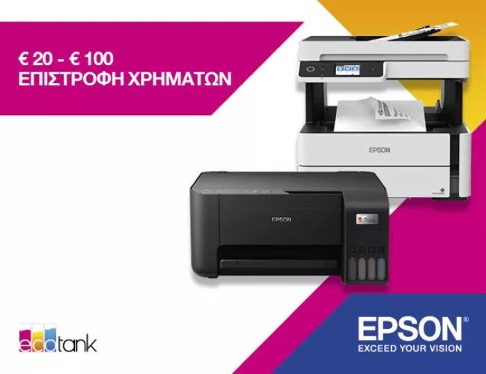 Η Epson, η ηγέτιδα εταιρεία τεχνολογίας που στόχο έχει την καινοτομία, αναζητώντας διαρκώς την ανάπτυξη νέων τεχνολογιών με στόχο την παροχή των πιο αξιόπιστων και ποιοτικών λύσεων εκτύπωσης και οπτικής απεικόνισης στους καταναλωτές της, επιστρέφει για ακόμη μια χρονιά με την προωθητική ενέργεια Cashback, η οποία αφορά τους εύχρηστους, best-seller εκτυπωτές της σειράς EcoTank.